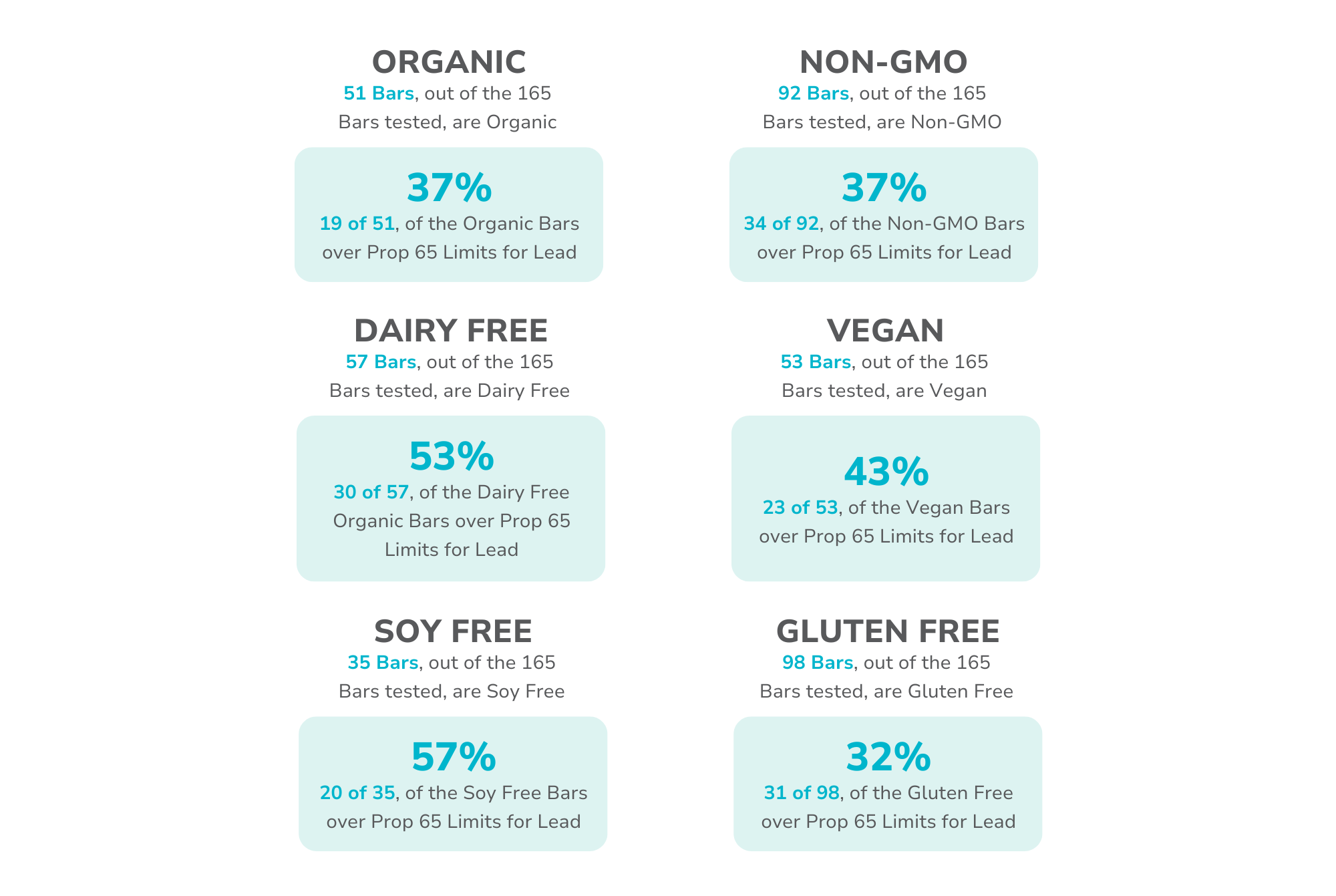 – 65% of Chocolate Protein Powders tested over Prop 65 levels and 29% tested over 2X Prop 65.