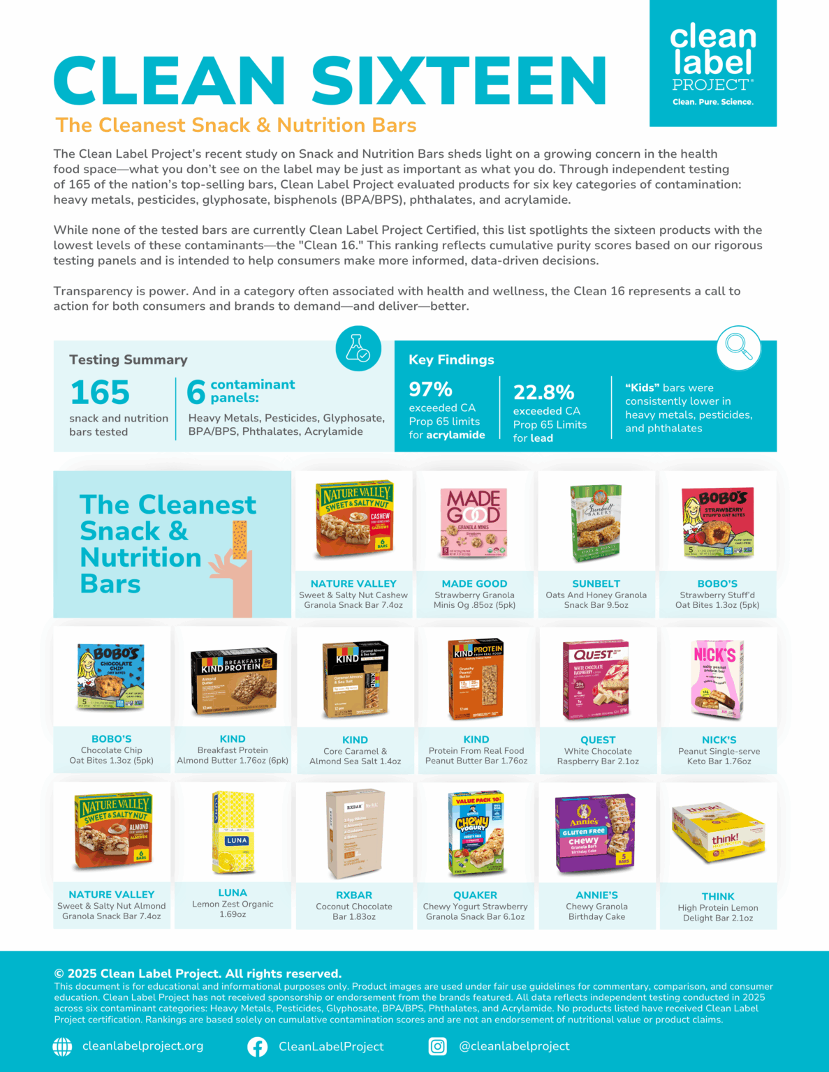 Clean Label Project purchased and rigorously tested 165 of the top-selling Snack and Nutrition Bars (sourced from Nielsen, SPINS and Amazon’s best-seller lists), supplemented with top products from the natural and organic marketplace. It also assessed multiple panels of industrial and environmental contaminants. Collaborating with an analytical chemistry lab, Clean Label Project amassed over 20,000 data points from 50 brands and 165 products to benchmark the findings.